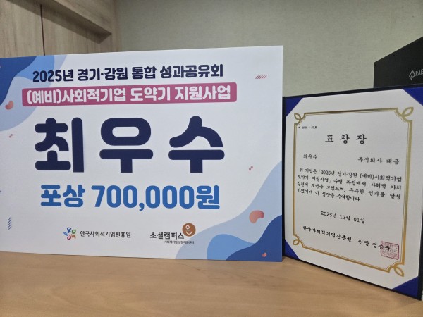 한국사회적기업진흥원 도약기지원사업_최우수상 수상 페이지 정보 작성자 주식회사태금 댓글 0건 조회 2회 작성일26-02-23 18:00 본문 2025년 경기.강원 사회적기업 도약기 지원사업 수행 과정에서 사회적 가치 실현에 모범을 보였으며, 우수한 성과를 달성하여 한국사회적기업진흥원 최우수상을 수상함. 목록보기