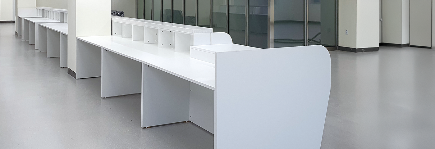 The counter, with a harmonious system for both standing and sitting, serves as a hub in public spaces. It functions as an informal office or start-up workspace, offering versatility and efficiency.